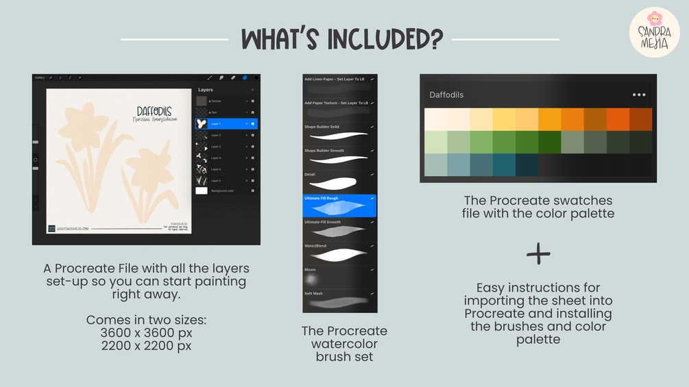 - 1 fully prepped Procreate file (Daffodils design) in two versions: 3600px x 3600px & 2000px x 2000 px (for smaller iPads that can’t handle too many layers)