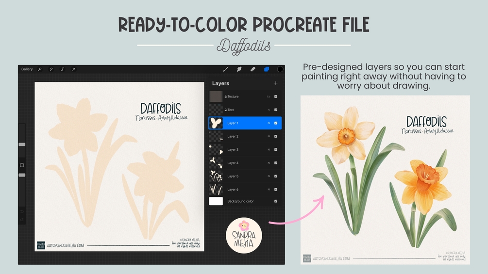 The Daffodil: Ready-to-Color Procreate File, has all the base layers already made so you can start painting in a relaxing and stress-free way, without the hassle of sketching or planning compositions.