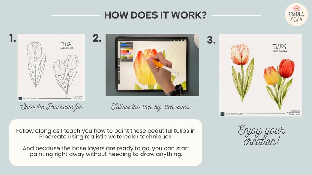 Want to bring your digital paintings to life but don’t know where to start? In this video tutorial, I’ll guide you step by step as I color the Tulips Ready-to-Color Procreate File (INCLUDED WITH THIS CLASS). Watch at your own pace, pause, rewind, and follow along!
